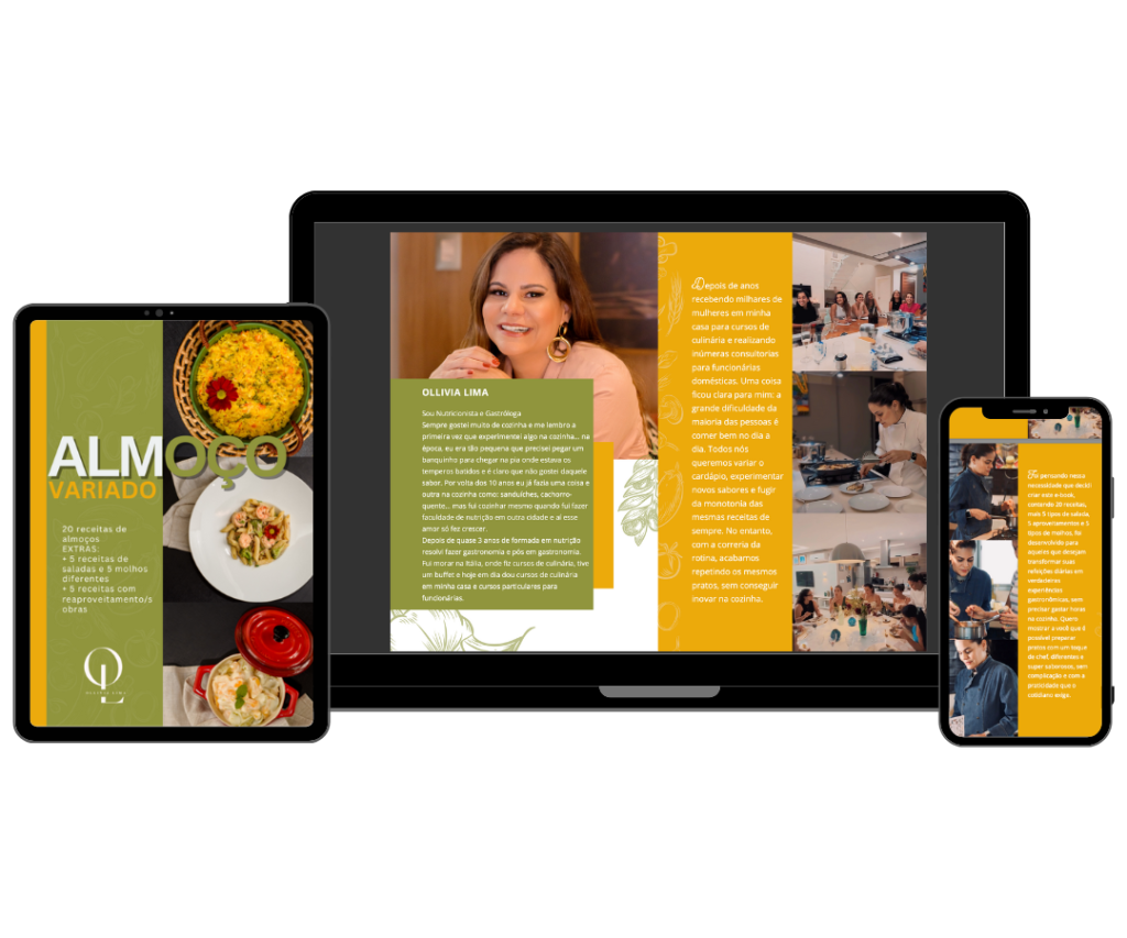 Ollivia Lima é nutricionista e gastróloga, apaixonada pela culinária desde a infância. Formada em Nutrição e Gastronomia, Ollivia possui anos de experiência em cursos de culinária, consultorias e agora compartilha seu conhecimento através de ebooks que transformam a rotina culinária de muitas pessoas.